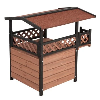 Weather-proof wooden cat house with a red bitumen roof, with a protected roof terrace complete with railings and a comfortable ladder entry, easy to assemble and ideal for free-roaming cats.