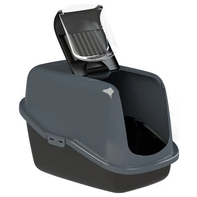 - Hooded litter tray for cats with a litter scoop and environmentally friendly wood litter